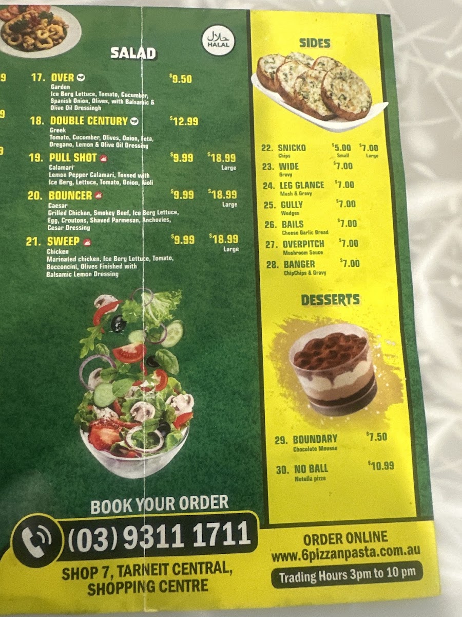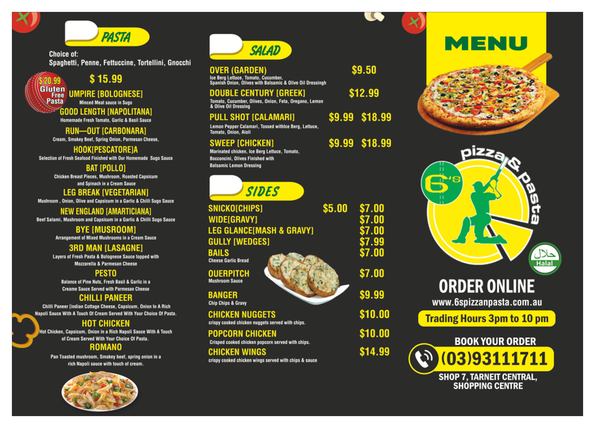 The menu at 6S Pizza & Pasta offers a delightful selection of Italian favorites, with a strong focus on fresh, high-quality ingredients. The standout dishes are undoubtedly their range of pizzas, which are a perfect balance of crispy crusts and savory toppings. The Margherita Pizza, topped with fresh basil and mozzarella, is a classic choice at $12, while the Pepperoni Pizza adds a bit of spice for $15. For something more unique, the BBQ Chicken Pizza combines tender chicken with smoky BBQ sauce for $16. Pasta lovers will find comfort in the Spaghetti Bolognese, a hearty dish priced at $14, featuring a rich meat sauce, or the creamy Fettuccine Alfredo at $16, which offers a velvety texture and indulgent flavor. Whether you're craving a traditional pizza or a pasta dish that feels like a warm embrace, 6S Pizza & Pasta delivers a memorable experience with every bite. The menu is a satisfying mix of classic Italian comfort food that doesn’t disappoint.